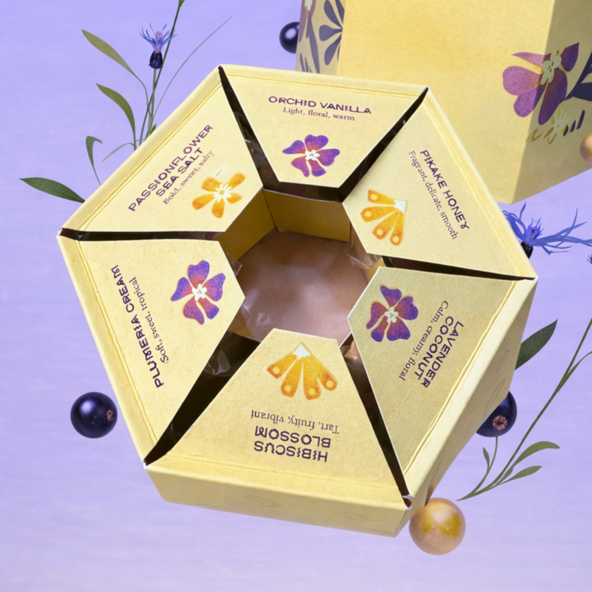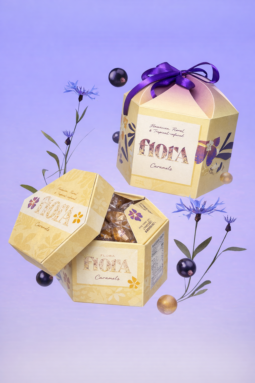 A Hawaiian-themed caramel confection candy packaging design that combines rich, indulgent tones with tropical-inspired visuals to create a warm, vibrant brand experience that feels both artisanal and transportive. The design incorporates a bold purple and yellow color palette paired with floral motifs to evoke island energy while maintaining a refined, modern aesthetic. Thoughtful typography and composition balance playfulness with sophistication, allowing the brand to stand out while still feeling cohesive and elevated.